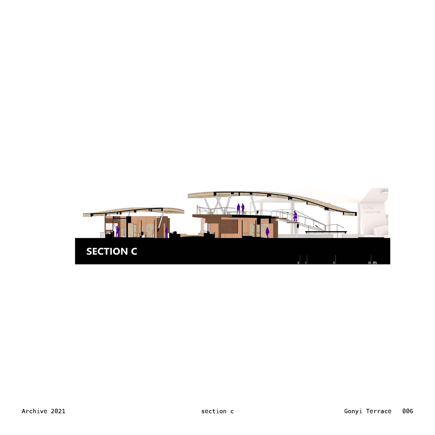 The east pavilion merges washroom with a street side tiered patio and a semi-outdoor bleacher on top. The bleacher is set to be in dialogue with the existing rotunda-like pavilion structure at the center of Gongyi park, injecting possibilities for it as a stage for performance and community events, or families hanging out on the platform while children playing down in the round space.