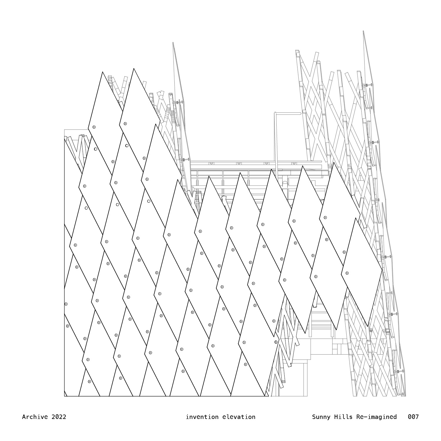 Our proposal for precedent re-invention hybridizes the complex wooden Jigoku-Gumi pattern used in Sunny Hills, with the elegant glass façade system of Peter Zumthor’s Kunsthaus Bregenz. By applying the same logic of wooden joinery, the intersection points of members were identified as the ideal location to start an experiment on hybrid transformation. In the thought of blending traditional and contemporary in a new façade system, the incorporation of glass sought to add new layers of materiality to the original precedent. The additional glass panels are shaped by the diamond grid used in Sunny Hills. This allows their edges to be fastened by four connection points that connect to the existing Jigoku-Gumi structure at its intersection, sitting on spider clips of customized angles. Each panel is slightly overlapped in projection while rotated at an angle. This generates a visual effect of waves of dazzling breathing fins, with the silhouette of the wooden structure as an opaque yet deeply layered backdrop. The resulting new space bears an expanded sense of enclosure that shelters the Jigoku-Gumi in a way of intentional exhibition.